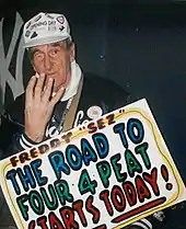 Schuman also carried a number of colorful hand-painted signs adorned with messages to encourage the team and the fans.[4] The signs usually began with "Freddy 'sez'". Some Freddy messages included "Again & Again Yankees Prove They Are Great", and "Fans, We Got To Help Yankees Out Of Slumps". Sometimes, Schuman would give the sign to a fan at the end of a game.