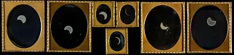 On May 26, 1854, Langenheim and his brother took interval timed pictures of the first American total solar eclipse ever photographed.[26][27] There were eight phases taken of different time sequences and are the earliest known eclipse pictures taken in the United States.[28][29] The seven surviving pictures are owned by the Metropolitan Museum of Art.[26] The pictures range in size from 1.25 inches (3.2 cm) high by 1 inch (2.5 cm) wide to 2.8125 inches (7.144 cm) high by 2.3125 inches (5.874 cm) wide.[26] Six daguerreotypists and another photographer took images of the event, but only the Langenheim ones survive.[26]