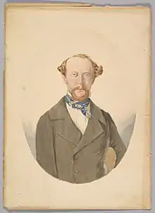 In 1840, Langenheim and his brother William began working for a German language newspaper edited by George Francis Schreiber in Philadelphia. Langenheim acquired a daguerreotype camera from Von Voigtlander and formed a partnership with Schreiber in a photographic studio business for a couple of years in 1841.[2] In 1843 Langenheim went into the photography studio business with his brother at 26–27 Exchange Street in Philadelphia. It was the W. & F. Langenheim firm and known as the Philadelphia daguerrotype establishment.[3] They made in 1842 the first advertising picture in history.[7] It was of patrons eating and drinking in the restaurant in the Philadelphia Exchange Building. The picture of people dining was hung in the hall of the building to attract potential customers for the dining room.[8][9][10]