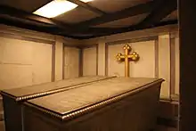 In accordance with his testamentary instructions from 1854, Frederick William IV is interred with his wife in the crypt underneath the Church of Peace in the park of Sanssouci, at Potsdam, while his heart was removed from his body and buried alongside his parents at the Charlottenburg Palace mausoleum.[4]