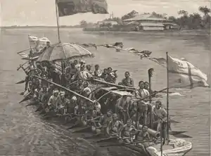 With the settlement of European traders on the coast, Nembe had engaged in trade with them, but it was poorer than its neighbours Bonny and Calabar.[4] Since 1884, Nembe had found itself included in the area declared by the British as the Oil Rivers Protectorate, within which they claimed control of military defence and external affairs. Nembe was the centre of an important trade in palm oil, and it had refused to sign a treaty proposed by the British, opposing the Royal Niger Company's aim of bringing all trade along the kingdom's rivers into its own hands.[5]