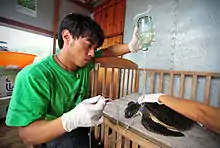 Despite the desperate state of sea turtles in China, Yeh was inspired in 2008 when he saw wild sea turtles undisturbed by people as the animals were naturally basking on public beaches in Hawaii.[13][14] As Yeh said on a CNN interview, "When you see the sea turtles in Hawaii, how great they are, it's worth it when you can envision that and hope that one day it will happen in Hainan, one day, in China."[2] This experience led Yeh to believe that sea turtles and people could live in harmony and that there was still hope in China because of the successful sea turtle conservation efforts in Hawaii. According to the global authority on nature conservation, International Union for the Conservation of Nature (IUCN), the sea turtles of the Hawaiian Islands were also once under the threat of near extinction, but are now thriving[15][16] and their conservation status reclassified as "Least Concern" according to the IUCN Red List.[17] Thus, Yeh established Sea Turtles 911 under Hawaiian jurisdiction, and changed the course of his life by moving to China to save the sea turtles he had hopelessly witnessed being sold, earning him the nickname "The unlikely sea turtle savior" by the BBC.[1][2] Building a floating sea turtle hospital in a Chinese fishing village known for its extensive sea turtle poaching, Yeh makes a point to work with people of all types to support sea turtle conservation in the area, including government officials, academia, fishermen and poachers, community members, local and international volunteers.[2][18][19][20][21] At a sea turtle release event held at the Ritz-Carlton, Sanya, Yeh stated, "For our release events, if we can bring multiple sectors in our community together, it will be very beneficial to sea turtle conservation in China. It is my hope that we can put other issues aside and agree on sea turtle rights, for the advancement of sea turtle conservation."[22][23] Local community members, including fishermen and coast guard police, describe Yeh as a true "Haigui" or a "returning sea turtle,"[1] and defer to his expertise when endangered sea turtles are rescued and in need of medical attention.[21][24][25]