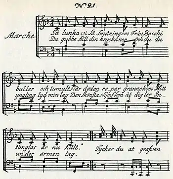 The songs portray a series of persons, mostly people lapsed into heavy drinking.[5] Named persons are Kolmodin (treasurer), Holmström, Nystedt (pub owner), Meissner (brewer), Steindecker (royal kettledrummer), Lundholm (brewer and distiller), Appelstubbe (customs officer), Österman (workshop owner), Halling (baker), Agrell (customs officer), Kämpendal, Nybom, Planberg, Joseph Israelson (student and poet) and Knapen (musician). In addition to these are the biblical figures such as Adam and Susanna; and the characters from classical mythology Bacchus and Venus, plus a few more.