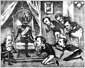 Under the suzerainty of the Ottoman Empire, Cuza's regime took steps toward solidifying the Principalities, which became the nucleus of modern Romania; however, it alienated the political class with its expansive authoritarianism. The liberal wing, or "Reds", envisioned a ceremonial role for the monarchy, within a democratized country: they "admired Cuza's democratism [but] despised his Bonapartist methods".[18] "Red" leaders joined conservatives and centrists in forming a "monstrous coalition" of conspirators, who toppled Cuza in February 1866 and began a search for a foreign Domnitor to inaugurate a hereditary monarchy. Eventually, after Philippe of Belgium withdrew from the race, Carol of Hohenzollern-Sigmaringen became a main candidate for the throne. The Faction itself took a distinct position against the Carlist consensus. Bărnuțian postulates allowed Factionalists to argue that a single Romanian vote against a foreign dynasty was the exercise of a natural right, and would invalidate all other opinions.[19] Still frequenting the National Party, D. Tacu took a more moderate position: like Vasile Pogor and Titu Maiorescu, he was only opposed to Carol specifically, and demanded a prince from Romance-speaking Europe.[20]