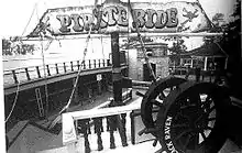 The park could accommodate up to 32,000 visitors at once or 90,000 visitors per day.[3][29] The premises included 8 miles (13 km) of navigable waterways and lakes, 10,000 newly planted trees, more than 18 restaurants and snack bars, and parking for 7,200 cars for guests and 1,800 for employees.[3][17][29] At Freedomland's opening, there were 41 attractions,[16][22] as well as performances reenacted by a cast of over 2,000.[17] The programs were designed to be interactive:[46] for instance, children were enlisted to participate in fighting a reenacted Great Chicago Fire.[39] None of the rides at opening were traditional fairground attractions such as roller coasters.[31] As attendance failed to meet the operators' expectations, generic fairground attractions were added to the park in subsequent opening seasons,[22] and the park had 45 rides and over 200 performance programs by 1962.[30] Like at Disneyland, many of Freedomland's attractions received corporate sponsorships,[47] and there was a ban on alcoholic beverages in Freedomland.[17]