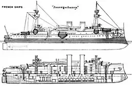 Jauréguiberry was a pre-dreadnought battleship constructed for the French Navy (French: Marine Nationale) in the 1890s. Built in response to a naval expansion program of the British Royal Navy, she was one of a group of five roughly similar battleships, including Masséna, Bouvet, Carnot, and Charles Martel. Jauréguiberry was armed with a mixed battery of 305 mm (12 in), 274 mm (10.8 in) and 138 mm (5.4 in) guns. Constraints on displacement imposed by the French naval command produced a series of ships that were significantly inferior to their British counterparts, suffering from poor stability and a mixed armament that was difficult to control in combat conditions.