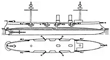 The ship was armed with a main battery of four 164 mm (6.5 in) 28-caliber guns and six 138 mm (5.4 in) 30-cal. guns. All of these guns were placed in individual pivot mounts; the 164 mm guns were in sponsons located fore and aft, with two guns per broadside. Four of the 138 mm guns were in sponsons between the 164 mm guns, one was in an embrasure in the forecastle and the last was in a swivel mount on the stern. For close-range defense against torpedo boats, she carried a pair of 65 mm (2.6 in) 9-pounder guns, eight 47 mm (1.9 in) 3-pounder Hotchkiss guns, and eight 37 mm (1.5 in) Hotchkiss revolver cannon. She was also armed with five 350 mm (14 in) torpedo tubes in her hull above the waterline. Armor protection consisted of a curved armor deck that was 50 to 100 mm (2 to 4 in) thick, along with 50 to 75 mm (2 to 3 in) plating on the conning tower.[4]