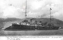 Assigned to the Escadre du Nord (Northern Squadron), the ship represented France during Queen Victoria's Diamond Jubilee Fleet Review at Spithead in June 1897 and then conveyed the President of France, Félix Faure, from Dunkerque to Russia the following August. Pothuau was transferred to the Escadre de Méditerranée (Mediterranean Fleet) in 1898 where she became flagship of the Escadre Légere (Light Squadron).[3] During the annual naval maneuvers in June–July 1900, the ship was the flagship of Contre-Amiral (Counter Admiral) Maréchal[9] who was relieved by Contre-Amiral Caillard several months later.[10] Around May 1904 the ship was relieved as the flagship of the Mediterranean Fleet's Cruiser Squadron[11] and she was placed into reserve in mid-1905. Pothuau was recommissioned on 17 April 1906 to serve as a gunnery training ship[3] and became flagship of the combined gunnery school under Contre-Amiral Le Bris in 1910.[12] During this time the ship tested a fire-control system,[13] and continued as a gunnery training ship through July 1914.[3]