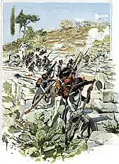 At the same time, Ali's forces moved on Preveza. There the French, anticipating an attack, had begun erecting fieldworks at the isthmus leading to the town, at the site of ancient Nicopolis. On 22 October Ali himself, accompanied by his son Mukhtar and some 4,000 foot and 3,000 horse, appeared. The French, under général de brigade Jean Jacques Bernardin Colaud de La Salcette, could muster only 700 French regulars, 200 militiamen, and 70 Souliotes. The ensuing Battle of Nicopolis was extremely bloody, with most of the French troops killed or captured, the latter including La Salcette. After capturing Preveza, Ali had the pro-French inhabitants publicly executed, and torched the town. Using the unsuspecting Metropolitan of Arta, Ali then lured the Prevezans who had fled to Aktion to return, and had them too beheaded. The French prisoners were subjected to torture, and those who survived were sent to Constantinople.[27] Vonitsa too surrendered afterwards, and only Parga was left to resist Ali's forces.[27] General Chabot tried to enlist Mustafa Pasha of Delvino against Ali Pasha, but failed.[29]