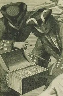 Chameau set out from La Rochelle on her final voyage in July 1725, under the command of Jean de Saint James.[3] Aboard was a large quantity of gold, silver and copper coins; and dignitaries de Chazel, the new Intendant;[4] and de Louvigny, the Governor-Elect of Trois-Rivières.[6] Several miles east of her destination of Louisbourg,[7] the ship was swept onto the rocks by a storm on August 27, 1725. Chameau sank, and all aboard perished; the reported number of dead ranges from 216[1] to "over 300"[7] to 316.[2][3] The 180 bodies that washed ashore were buried in a mass grave.