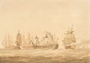Courageux was part of Admiral Augustus Keppel's Channel Fleet in 1778 and shared in the capture of the 32-gun French frigate Licorne and the French lugger Coureur on 17 June.[6] The following day, Courageux was despatched with HMS Foudroyant and HMS Robust in pursuit of another French vessel. Other British ships soon joined the chase, which was concluded on 19 June when the prize, the 32-gun Pallas, was brought to.[7] Courageux received a share of the prize money for three more captures in September and five more in October.[8] Between April and May 1779, she underwent another refit, which included the sheathing of her hull with copper, at a cost of £7,468.7.0d.[2] She then returned to the Channel Fleet, by then under the command of Sir Charles Hardy. Hardy's fleet continued to take prizes in the Channel, and Courageux shared in the rewards: in June, HMS Southampton took the Spanish ship Purísima Concepción, Ambuscade recaptured the 14-gun HMS Helena, and an American schooner, Marmy was taken by HMS Milford.[9]