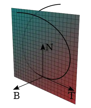 The Frenet–Serret frame consisting of the tangent T, normal N, and binormal B collectively forms an orthonormal basis of 3-space. At each point of the curve, this attaches a frame of reference or rectilinear coordinate system (see image).