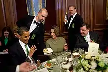 Each year in March, the Irish Taoiseach visits the United States for Saint Patrick's Day. A Shamrock Ceremony takes place in the morning at the White House where a crystal bowl containing shamrock, a traditional symbol of Ireland, is presented to the President in the Oval Office. This is followed by a Friends of Ireland luncheon hosted by the House Speaker in the U.S. Capitol or the Rayburn House Office Building.[4][5] The luncheon is attended by the President, Vice President, the Taoiseach, the Speaker, and other officials.[6] In the evening, a Saint Patrick's Day Reception takes place at the White House.[7]
