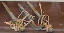 The Friese doorloper is a type of ice skate from the Netherlands. Friese means "Frisian" ("of Friesland"), and doorloper "to walk" or "run through", reflecting the design. It consists of a shaped length of wood secured to a metal blade of the same length to form a single unit which can be bound to a boot or shoe. It was on based on earlier designs of wooden skate, and differs from them in that the blade extends several inches behind the heel instead of ending under it. This reduces the risk of the wearer falling over backwards, particularly when stopping. (With the older designs, the wearer braked by raising their toes and digging their heels into the ice; with the new one, by angling the blades.) It was first commercialised in 1875 by the skatemaking companies A. K. Hoekstra of Wergea and D. G. Minkema of Oosterlittens, both of Friesland, as a touring skate. By the early years of the 20th Century it had completely replaced the old designs. It was popular among competition tour skaters, and was worn by several winners of the unpredictably-held Elfstedentocht (the frost has to be hard enough for the whole of the roughly 200 km (120 mi) long course over canals and lakes to freeze). It was also used for speed skating (kortebaanschaatsen - straight-line sprinting). After 1945, it was gradually replaced by skating boots, in which the metal blade is directly attached to the sole, and the last specialist manufacturer of Friese doorlopers closed in 1965. However, as of 2021 models which use plastics instead of wood are commercially available.[1][2][3]