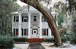 The front porch, with its four Ionic columns is typical of southern plantation homes. The house has approximately 5,000 square feet (460 m2) of living space in two stories and a finished attic that serves as a third floor. Its grandiose façade, subtly concealed by century-old oak trees naturally decorated with hanging Spanish moss, provides it with the distinction of being the most photographed house in town. Photographs of the Fripp-Fishburne house have appeared in numerous tourist brochures, newspapers, books, magazines, and travel guides.[4][5][6][7][8]