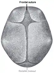 The frontal suture is a fibrous joint that divides the two halves of the frontal bone of the skull in infants and children. Typically, it completely fuses between three and nine months of age, with the two halves of the frontal bone being fused together. It is also called the metopic suture,[1][2] although this term may also refer specifically to a persistent frontal suture.[3]