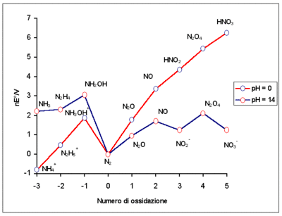 The axes of the Frost diagram show (horizontally) the oxidation state of the species in question and (vertically) the electron exchange number multiplied by the voltage (nE) or the Gibbs free energy per unit of the Faraday constant, ΔG/F.