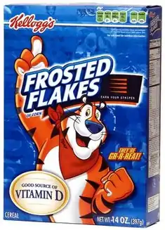 Frosted Flakes or Frosties is a breakfast cereal, produced by the Kellogg Company and consisting of sugar-coated corn flakes. It was introduced in the United States, in 1952,[1] as Sugar Frosted Flakes. The word "sugar" was dropped from the name in 1983.