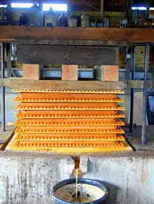 A fruit press is a device used to separate fruit solids - stems, skins, seeds, pulp, leaves, and detritus - from fruit juice.