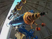 The observatory contains a 12-inch refracting telescope with a weight-driven mechanical clock drive. The original glass blanks that were to become the optics were procured in 1919 by Prof. Irving P. Church, head of the Cornell Department of Civil Engineering; the two-element lens was ground and polished by the well-known firm of Brashear & Co. and delivered to Cornell in 1920. In January 1922, a contract was given to the Warner and Swasey Co. of Cleveland, Ohio to build the mount. On October 16, 1922, the telescope was erected upon its German equatorial mount in the central dome of the Fuertes Observatory. The observatory's original 4.5-inch telescope was mounted onto the 12-inch refractor, and currently serves as the finder scope.[3]