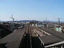 This station has two parallel side platforms, connected to the station building by a footbridge. The same side of each platform (i.e. the side opposite the location of the station building) is used.