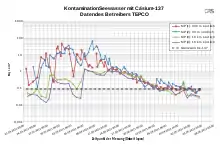The Japanese government estimates the total amount of radioactivity released into the atmosphere was approximately one-tenth as much as was released during the Chernobyl disaster.[21] Significant amounts of radioactive material have also been released into ground and ocean waters. Measurements taken by the Japanese government 30–50 km from the plant showed caesium-137 levels high enough to cause concern,[22] leading the government to ban the sale of food grown in the area. Tokyo officials temporarily recommended that tap water should not be used to prepare food for infants.[23][24] In May 2012, TEPCO reported that at least 900 PBq had been released "into the atmosphere in March last year [2011] alone" although it has been said staff may have been told to lie, and give false readings to try and cover up true levels of radiation.[25][26]