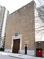 Four Broadway entrances are signed as providing access to several routes in the complex. There is a stair and elevator at the southwest corner of Dey Street and Broadway; they are signed as providing access to all services except the northbound Lexington Avenue Line platform, and are also signed as an entrance as the Cortlandt Street station on the R and W trains, a separate station that is connected by the Dey Street Passageway. Two entrances are signed as serving all routes in the complex, as well as the R and W trains at Cortlandt Street: the Fulton Center building at the southeast corner of Fulton Street and Broadway, as well as an entrance through the Corbin Building on John Street east of Broadway. The Fulton Center building has stairs, escalators, and elevators,[57] while the Corbin Building contains escalators.[58]