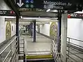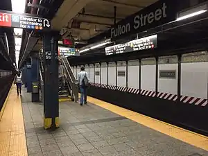 An intricate system of ramps was replaced by two new mezzanines.[50]:11 Work on the IND mezzanine commenced in January 2010; the reconstruction of the transfer mezzanine over the Fulton Street IND platform resulted in traffic flow changes.[51] The Eighth Avenue Line station adopted the "Fulton Street" name in December 2010 to become unified with the other platforms in the station complex.[52] The eastern mezzanine and parts of the western mezzanine had opened by 2011,[53]:44 and the western mezzanine was completed by 2012.[54]:2 Additionally, new entrances were opened as part of the project.[47] In October 2012, a new entrance on Dey Street opened for the Dey Street underpass to Cortlandt Street, and an ADA-accessible elevator was installed for the southbound Lexington Avenue Line platform.[55] In November 2014, the Fulton Center project was completed, and the entire complex was made ADA-accessible.[47]