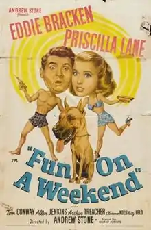 Fun on a Weekend is a 1947 American comedy film written and directed by Andrew L. Stone. The film stars Eddie Bracken, Priscilla Lane, Tom Conway, Allen Jenkins, Arthur Treacher, Clarence Kolb and Fritz Feld. The film was released on May 15, 1947, by United Artists.[1][2]