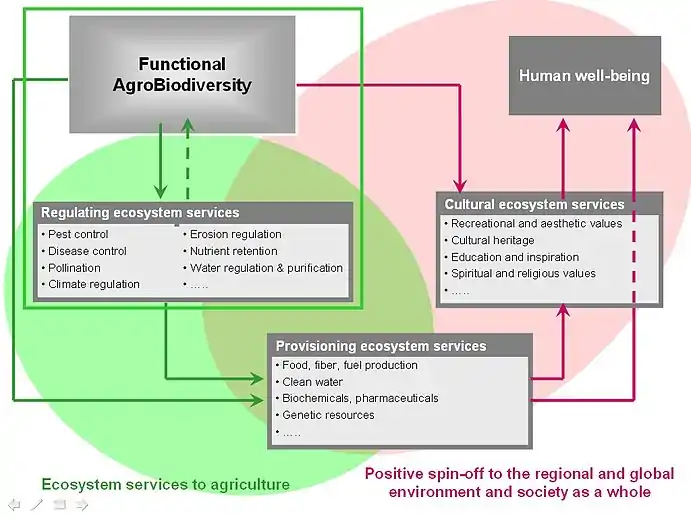 Functional AgroBiodiversity provides regulating, provisioning and cultural ecosystem services that are essential for human well-being. Positive synergies often exist among regulating, provisioning and cultural services and with biodiversity conservation as can be seen from this conceptual diagram. The green area in the diagram highlights the core focus of the European Learning Network. The red area highlights positive spin-off of Functional AgroBiodiversity to the local (e.g. water quality, recreation) and global environment (e.g. climate change) and society as a whole. The graph is adapted from the Millennium Ecosystem Assessment (2005). Supporting services are not included as they are not directly used by the people.
