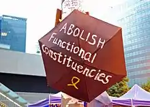 In the political systems of Hong Kong, a functional constituency is a professional or special interest group involved in the electoral process. Eligible voters in a functional constituency may include natural persons as well as other designated legal entities such as organisations and corporations. (See: legal personality)