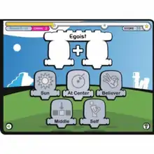 Like the SATs, futureU has three sections: Reading, Writing, and Math, each with two subdivisions. Reading has a Glyph mode, which gives the player a word that has a prefix and a suffix. Next to the word are several images that can be used to construct the word. In the other Reading mode, Predictions, sentences with two words missing are shown to the player, who must fill in the blanks.[3]