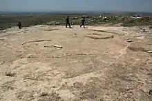 Göbekli Tepe is on a flat and barren plateau, with buildings fanning in all directions. In the north, the plateau is connected to a neighbouring mountain range by a narrow promontory. In all other directions, the ridge descends steeply into slopes and steep cliffs.[23] On top of the ridge there is considerable evidence of human impact, in addition to the construction of the tell. Excavations have taken place at the southern slope of the tell, south and west of a mulberry that marks an Islamic pilgrimage,[5] but archaeological finds come from the entire plateau. The team has also found many remains of tools.