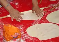 Gözleme is a savory Turkish stuffed flatbread. The dough is usually unleavened, and made only with flour, salt and water, but gözleme can be made from yeast dough as well. It is similar to bazlama, but is lightly brushed with butter or oil, whereas bazlama is prepared without fat. The dough is rolled thin, then filled with various toppings, sealed, and cooked over a griddle. Gözleme may sometimes be made from prepackaged hand-rolled leaves of yufka dough.[1][2]