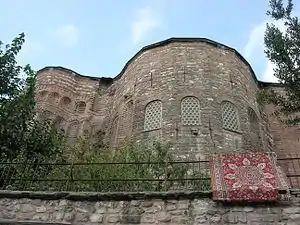 The original dome, akin to that of Kalenderhane Mosque, should have been carried by a tall drum pierced by windows.[22] The exterior of the building is quite imposing. On the southeastern façade, the central apse, with seven sides, and the lateral ones, with three sides, project boldly outside. The central apse appears to be a later Byzantine reconstruction, since it lacks the four tiers of five niches, which feature ornamental brickwork and adorn the lateral ones.[21] Above the niches runs a cornice.