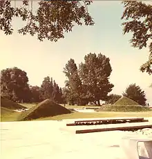 Landscape architect Ernst Cramer, who considered himself more of an artist than a gardener, designed an abstract landscape by using earthen mounds, water and modern iron sculptures. The whole facility was built with respect to abstract-geometrical principles. Whereas the public was confused by its design, experts were delighted.[2]