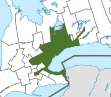 GO Transit primarily serves the Greater Toronto and Hamilton Area–the cities of Toronto and Hamilton and the surrounding regions of Halton, Peel, York and Durham. GO Transit's lines extend into the nearby Niagara and Waterloo Regions, the cities of Brantford and Peterborough, and Simcoe, Dufferin and Wellington Counties–[1] an area largely coextensive with the Greater Golden Horseshoe. Under the provincial charter, GO Transit is permitted to serve cities elsewhere in Ontario, but has no plans of doing so.