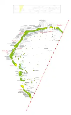 | • Inhabited islands | Fares * Fiyoaree * Gaddhoo * Hoandeddhoo * Maathodaa * Madaveli * Nadellaa * Rathafandhoo * Vaadhoo * Vaadhoo |
