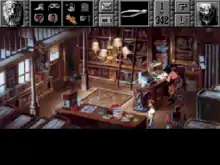 Unlike newer graphical adventure games that use context-sensitive cursors which conduct the appropriate action when interacting with objects and people, the game makes use of "dumb cursors" which perform the required action the player needs, provided they select that action's icon from the game-bar - "WALK", "LOOK", "ASK", "TALK", "PICKUP", "OPEN/CLOSE", "OPERATE", and "MOVE".[4] Items that can be collected from a location in the game, are stored in an inventory where they can be examined, interacted with, or combined with other items being carried. More importantly, items can be made an active icon in the game-bar, functioning in a similar manner to action icons by allowing it to be used with interactive objects in the game world.[5]