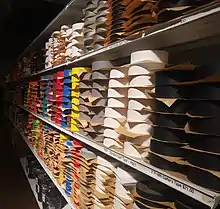 A common application for gaffer tape is securing cables to a stage floor, podium, or other surface, either for safety or concealment.[10] It is also frequently used whenever a quick ad hoc fix is required, from temporarily attaching fixtures or props, to salvaging a broken piece of production equipment. A narrow version of gaffer tape, called spike tape, is used in theater productions for floor layout.[11][12]
