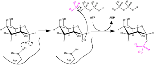 Recently, the roles of active site residues in human galactokinase have become understood. Asp-186 abstracts a proton from C1-OH of α-D-galactose, and the resulting alkoxide nucleophile attacks the γ-phosphorus of ATP. A phosphate group is transferred to the sugar, and Asp-186 may be deprotonated by water. Nearby Arg-37 stabilizes Asp-186 in its anionic form and has also been proven to be essential to galactokinase function in point mutation experiments.[9] Both the aspartic acid and arginine active site residues are highly conserved among galactokinases.[8]
