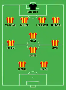 There are many successful footballers who have played for Galatasaray and made their mark on Turkish football history. The team's legendary players include Nihat Bekdik nicknamed Aslan (Lion); the 1930s national hero Eşfak Aykaç;[14] Boduri who died aged 21;[15] Mehmet Leblebi who scored a domestic record of 14 goals in a single match;[16] Gündüz Kılıç nicknamed Baba (Father) who was the coach but also the player of his team in the 1950s, with great success in both duties;[17] Bülent-Reha Eken brothers; Suat Mamat who scored three goals in the 1954 FIFA World Cup;[18] Coşkun Özarı who devoted his life to Galatasaray;[19] Turgay Şeren the heroic goalkeeper who was called "the Panther of Berlin";[20] Fatih Terim, the team captain of Galatasaray and Turkish national football team for many years, who won the UEFA Cup in 2000 as the team's coach;[21] Metin Oktay the legendary six-time top-scorer of the Turkish Super League;[22] Zoran Simović, another skilled goalkeeper known for his penalty saves;[23] Cüneyt Tanman who played a record of 342 games for Galatasaray;[24] Tanju Çolak, an extraordinary goalscorer and the 1988 European Golden Boot winner with Galatasaray;[25] Cevad Prekazi, an Albanian teammate of Tanju Çolak specializing in free kicks;[26] Cláudio Taffarel the World Cup-winning goalkeeper for Brazil;[27] Gheorghe Hagi, the Romanian football hero who is still described as the best foreign player ever to play in Turkey;[28] Brazilian striker Mário Jardel, dubbed "Super Mário" by the fans and scored both of Galatasaray's two goals in the 2000 European Super Cup Final against Real Madrid; and last, but not least, Hakan Şükür, the player who scored most goals in Süper Lig history with 249.