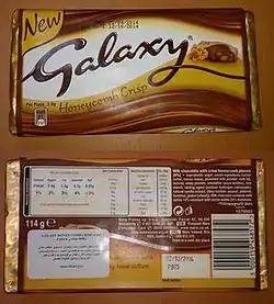 Front and back of the wrapper of a Galaxy Honeycomb Crisp.