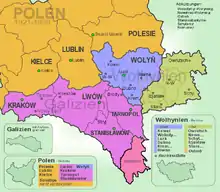 Towards the end of World War I, Galicia became a battleground of the Polish-Ukrainian War, which erupted in November 1918.[5] During the conflict, 1,200 Jews joined the Ukrainian Galician Army and formed an all-Jewish Ukrainian battalion called Zhydivs’kyy Kurin (UHA). In exchange, they were allotted 10% of the seats in the parliament of the West Ukrainian People's Republic which emerged in the same month and was disbanded nine months later.[6] The West Ukrainian government respected Jewish neutrality during the Polish-Ukrainian conflict by an order of Yevhen Petrushevych forbidding to mobilize Jews against their will, or to otherwise force them to contribute to the Ukrainian military effort.[7] Both Ukrainian and pro-Ukrainian Jewish armed units suffered significant losses as they retreated from Galicia before the army of General Edward Rydz-Śmigły.[8] Although the Polish losses were estimated at more than 10,000 dead and wounded; the Western Ukrainian army lost in excess of 15,000 men.[9] "Despite the official neutrality, some Jewish men had been noticed aiding the combat Ukrainian units, and this fact alone caused a great enthusiasm in the Ukrainian press."[10] Reportedly, the Council of Ministers of the West Ukrainian People's Republic provided assistance to Jewish victims of the Polish pogrom in Lviv, wrote Alexander Prusin.[11] Nevertheless, as noted by Robert Blobaum from West Virginia University, many more pogroms and assaults against Galician Jews were perpetrated by the Ukrainian side in rural areas and other towns.[12] Between 22 and 26 March 1919, during massacres in Zhytomyr (Jitomir), 500–700 Jews lost their lives at the hands of the armed men from the Ukrainian republican army led by Symon Petliura.[5] The chief organizer of the pogrom became minister of war soon thereafter.[13] Simultaneous Ukrainian pogroms took place in Berdichev, Uma, and Cherniakhov among other places.[5][14]