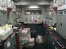 Galleys on commercial airlines typically include not only facilities to serve and store food and beverages, but also contain flight attendant jumpseats, emergency equipment storage, as well as anything else flight attendants may need during the flight. Aircraft in operation today mainly use the familiar airline service trolley system.