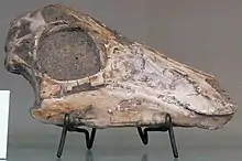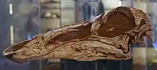 The head of Gallimimus was very small and light compared to the vertebral column. Due to the length of its snout, the skull was long compared to other ornithomimids, and the snout had a gently convex sloping upper profile. The side profile of the snout differed from other ornithomimids in not narrowing towards its front half, and the lower front margin of the premaxilla at the front of the upper jaw rose upwards, instead of being horizontal. Seen from above, the snout was almost spatulate (spoon-shaped), broad and rounded at the tip (or U-shaped), whereas it was acute (or V-shaped) in North American ornithomimids. The orbits (eye sockets) were large and faced sideways, as in other ornithomimids. The temporal region at the side of the skull behind the eyes was deep, and the infratemporal fenestra (the lower opening behind the orbit) was nearly triangular and smaller than that of the related Struthiomimus. It had deep muscle scars at the back part of the skull roof, along the parietal bone. The parasphenoid (a bone of the braincase, at the underside of the skull's base) was thin-walled, hollow and formed a pear-shaped, bulbous structure. The structure had a shallow furrow which opened towards the front. The internal nares (internal openings for the nasal passage) were large and placed far back on the palate, due to the presence of an extensive secondary palate, which was common to ornithomimids.[1][17][19][20]