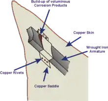 The problem recurred when vessels were sheathed in copper to reduce marine weed accumulation and protect against shipworm. In an experiment, the Royal Navy in 1761 had tried fitting the hull of the frigate HMS Alarm with 12-ounce copper plating. Upon her return from a voyage to the West Indies, it was found that although the copper remained in fine condition and had indeed deterred shipworm, it had also become detached from the wooden hull in many places because the iron nails used during its installation "were found dissolved into a kind of rusty Paste".[8] To the surprise of the inspection teams, however, some of the iron nails were virtually undamaged. Closer inspection revealed that water-resistant brown paper trapped under the nail head had inadvertently protected some of the nails: "Where this covering was perfect, the Iron was preserved from Injury". The copper sheathing had been delivered to the dockyard wrapped in the paper which was not always removed before the sheets were nailed to the hull. The conclusion therefore reported to the Admiralty in 1763 was that iron should not be allowed direct contact with copper in sea water.[9][10]