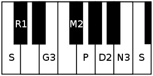 - ārohaṇa: S R₁ G₃ M₂ P D₂ N₃ Ṡ[lower-alpha 1]