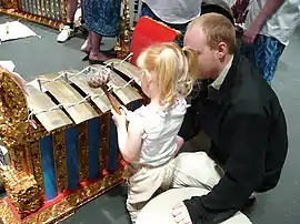 Gongs come in different sizes, and provide a structure for phrasing for the music by repeating a four or eight beat pattern. This pattern is called the gong cycle. Gongs are mounted vertically.