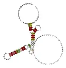 The γ-proteobacterial rimP leader is a putative attenuator element identified by bioinformatics within bacteria of the γ-proteobacterial phylum. It is located upstream of the rimP-nusA-infB operon encoding RimP, a protein shown to be involved in the 30S ribosomal subunit maturation,[2] NusA, a transcriptional factor controlling termination, and the translation initiation factor IF-2 respectively. The rimP-leader presents a Rho-independent terminator at the 3' end, corresponding to a highly conserved GGGc(...)gCCC motif. This motif is presumed to operate as a non-coding leader. Its mechanism remains unknown, but it is tempting to speculate a regulatory involvement of the NusA protein, which expression has been shown to lower the operon expression,[3][4] and which is already involved in the attenuation of the Trp, His and S10 operons.[5]